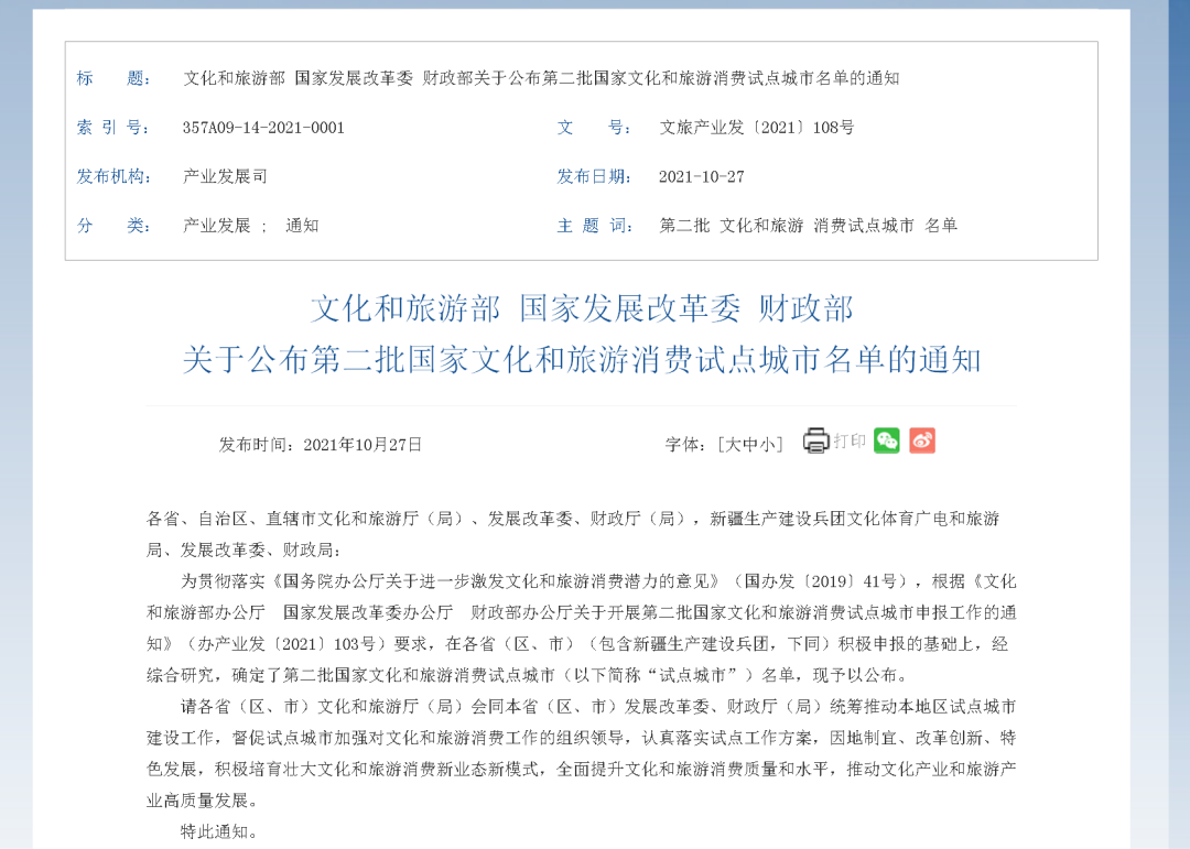 2020年10月,为稳步推进文化和旅游消费工作,文化和旅游部、国家发展改革委、财政部决定开展文化和旅游消费试点示范工作,启动第一批国家文化和旅游消费试点城市、国家文化和旅游消费示范城市申报评选工作。