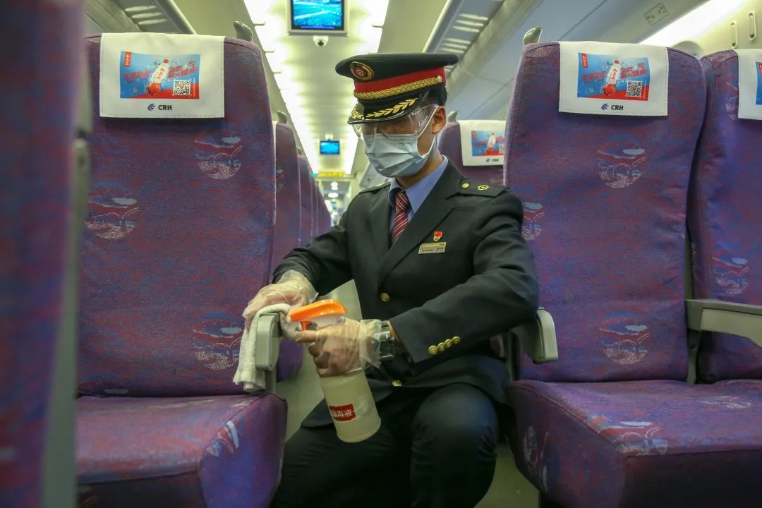 列车在运行途中,列车员还会定时对门把手、水阀、卫生间等区域进行预防性消毒,保持环境整洁卫生。