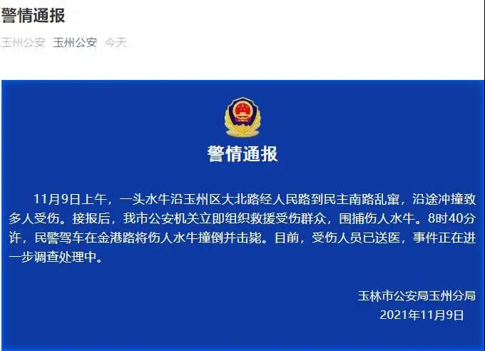 中午11时43分,玉林警方发布情况通报称,伤人水牛已被击毙,伤员已被送医。
