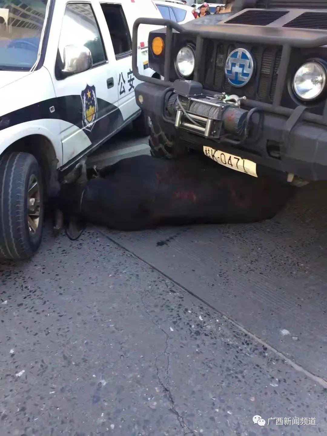 事件发生后,巡特警迅速出动,用车辆撞倒水牛之后,民警果断开枪,将水牛制服。
