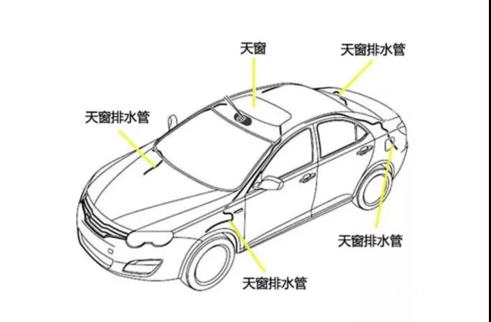 天窗的左右两侧是各有一条滑轨, 用于天窗前后滑动;滑轨两端各有一个排水孔,由导水槽连接。雨水落到天窗上,经导水槽流入排水孔,沿管道从汽车的前后轮挡泥板处流向地面。