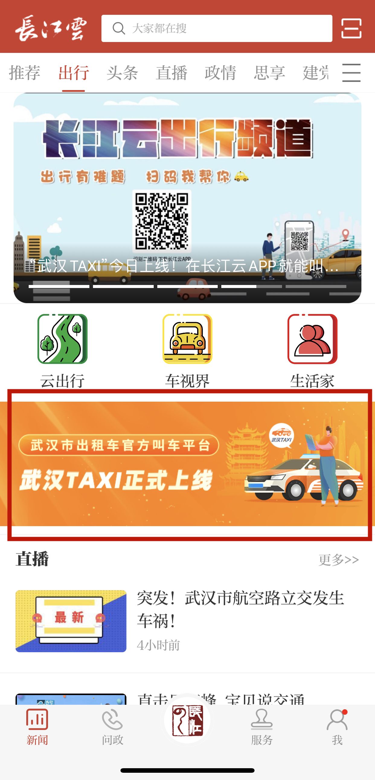 目前在长江云出行频道已嵌入“武汉TAXI”小程序,长江云用户可通过“武汉出租车行业叫车平台”呼叫出租车。