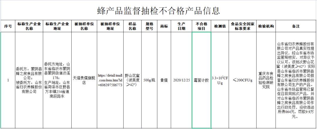 天猫贵儒旗舰店(经营者为山东省临沂市蒙阴县蜂之房食品有限公司)在天猫商城(网店)销售的、标称山东省临沂市蒙阴县蜂之房食品有限公司委托山东省归农养蜂股份有限公司生产的野山花蜜(波美度≥42°),经重庆市食品药品检验检测研究院检验发现,其中霉菌计数不符合食品安全国家标准规定。山东省归农养蜂股份有限公司对产品真实性提出异议。山东省市场监管局核实后,确认该批次野山花蜜实际是山东省临沂市蒙阴县蜂之房食品有限公司假冒山东省归农养蜂股份有限公司生产的产品,认可提出的真实性异议。山东省市场监管局已责成召回不合格的假冒产品,并没收违法所得864元,罚款9.9万元。