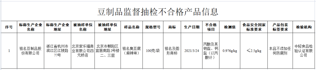 北京家乐福商业有限公司四元桥店销售的、标称浙江省杭州市祖名豆制品股份有限公司生产的祖名臭豆腐(麻辣味),经中轻食品检验认证有限公司检验发现,其中丙酸及其钠盐、钙盐(以丙酸计)检测值不符合产品标签标示要求。
