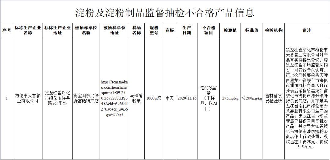 淘宝网东北绿野富硒特产店(经营者为黑龙江省绥化市海伦市海兴镇绿野食品商店)在淘宝网(网店)销售的、标称黑龙江省绥化市海伦市天意薯业有限公司生产的马铃薯粉条,经吉林省食品检验所检验发现,其中铝的残留量(干样品,以Al计)不符合食品安全国家标准规定。