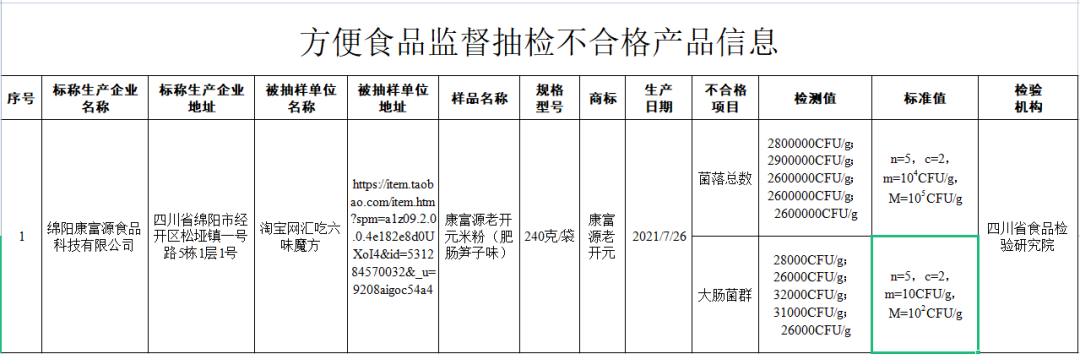 淘宝网汇吃六味魔方(经营者为四川六味魔方电子商务有限公司)在淘宝网(网店)销售的、标称四川省绵阳康富源食品科技有限公司生产的康富源老开元米粉(肥肠笋子味),经四川省食品检验研究院检验发现,其中菌落总数、大肠菌群数不符合食品安全国家标准规定。