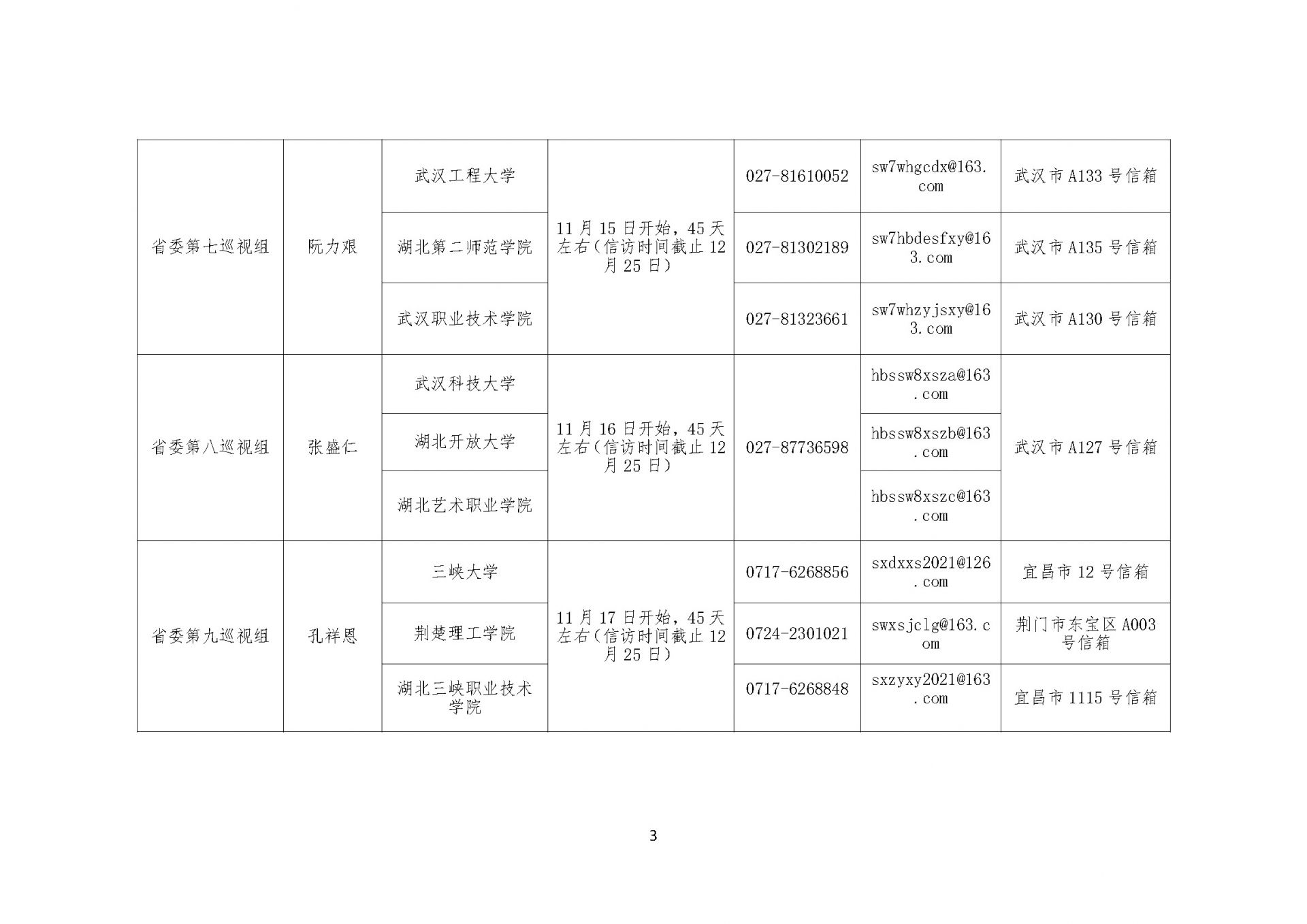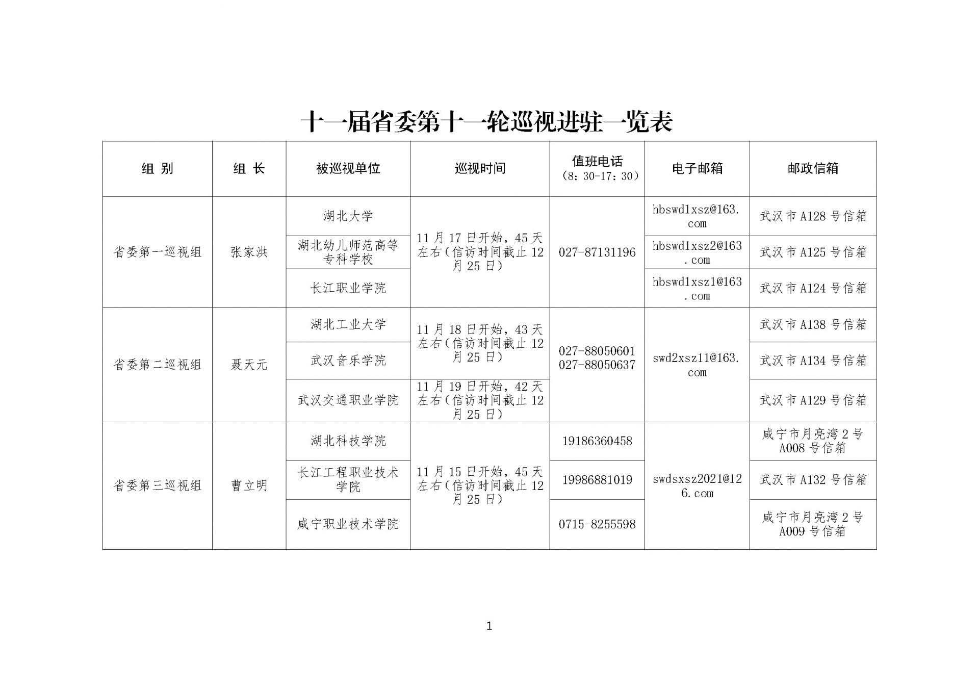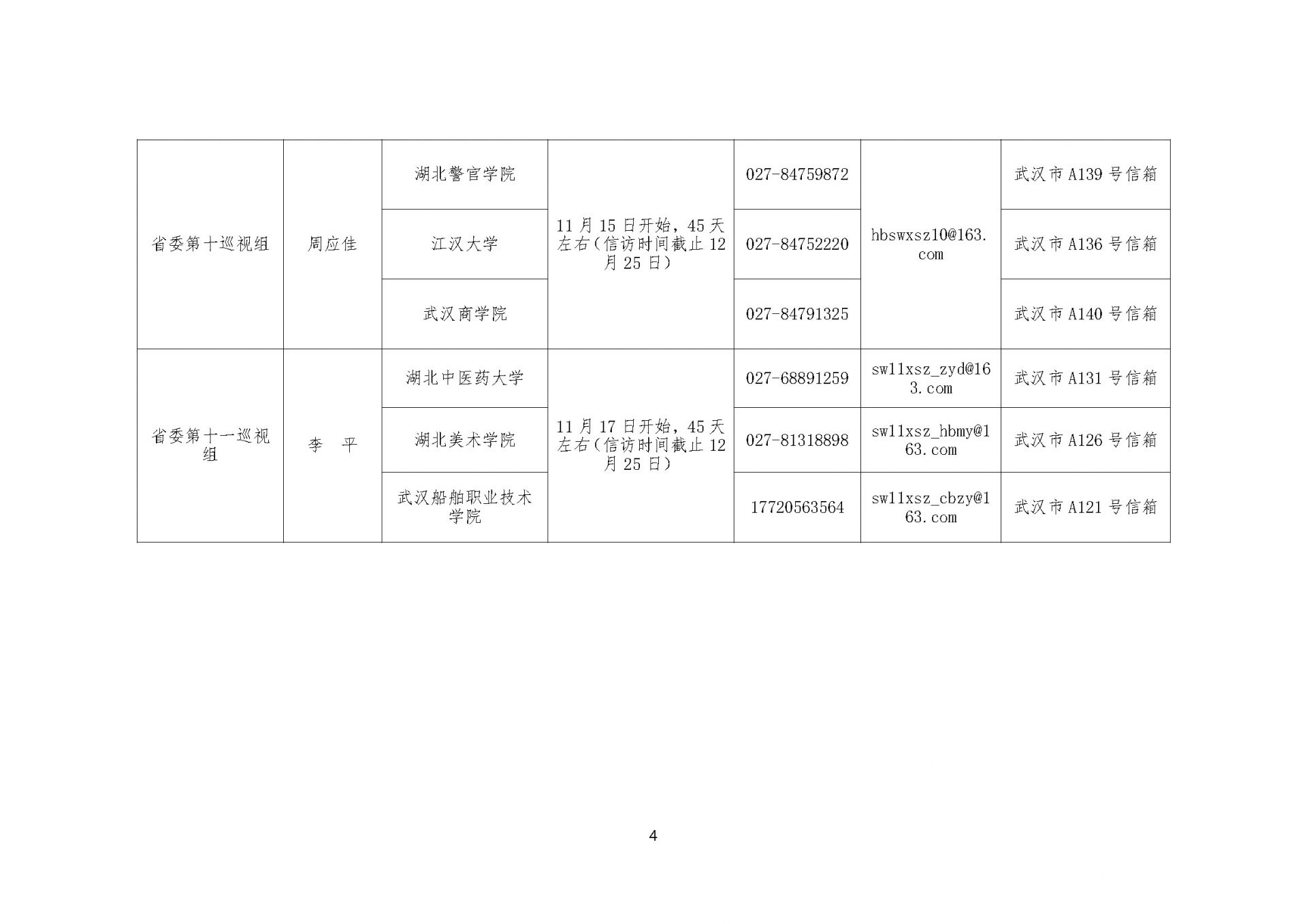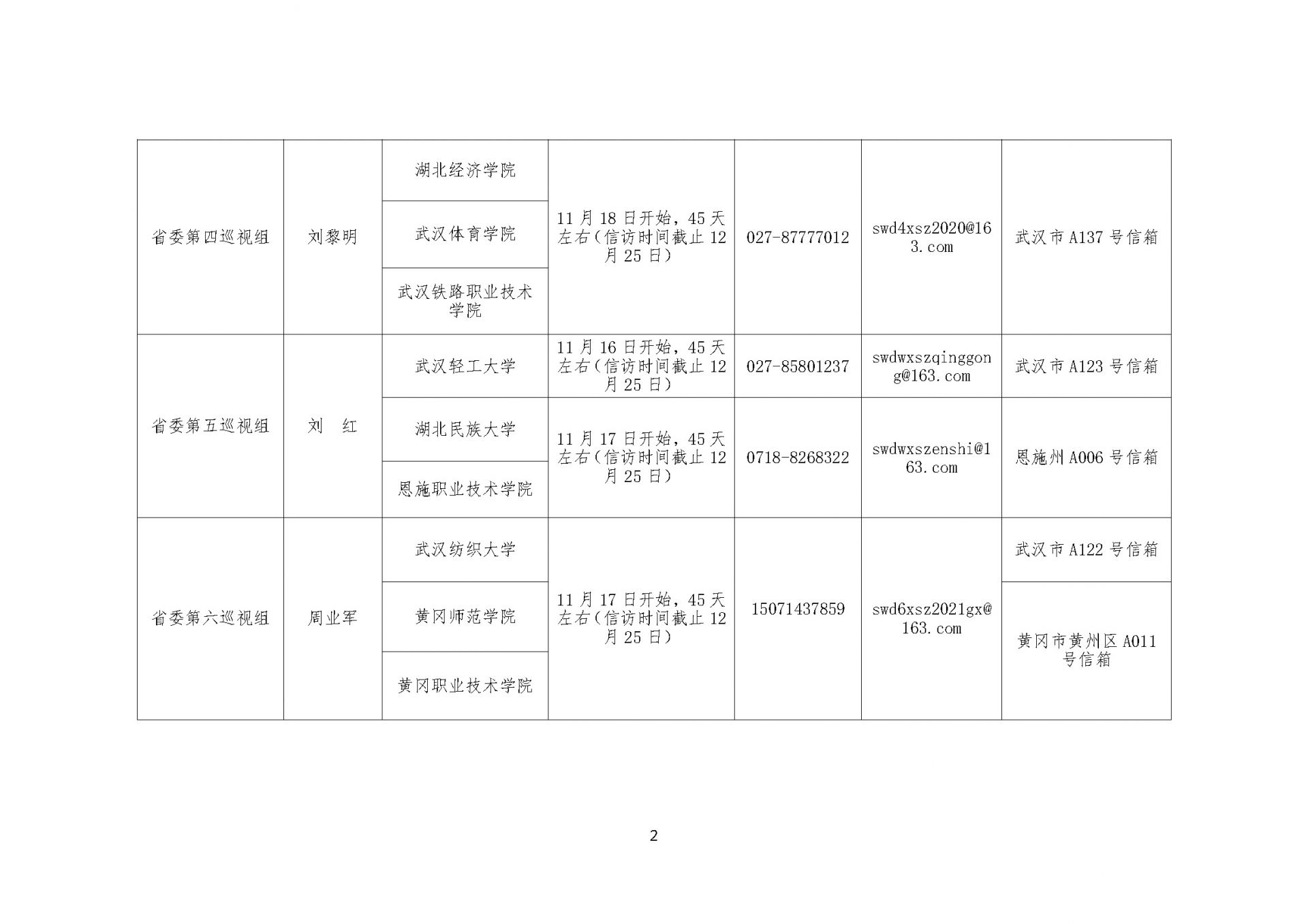 根据省委统一部署,本轮巡视将对湖北大学、武汉科技大学、湖北工业大学、武汉工程大学、武汉纺织大学、湖北中医药大学、武汉轻工大学、武汉体育学院、武汉音乐学院、湖北美术学院、湖北第二师范学院、湖北经济学院、湖北警官学院、三峡大学、湖北民族大学、湖北科技学院、黄冈师范学院、荆楚理工学院、湖北开放大学、湖北幼儿师范高等专科学校、武汉职业技术学院、武汉船舶职业技术学院、武汉交通职业学院、武汉铁路职业技术学院、长江职业学院、长江工程职业技术学院、湖北艺术职业学院、江汉大学、武汉商学院、黄冈职业技术学院、恩施职业技术学院、湖北三峡职业技术学院、咸宁职业技术学院共33所省属高校党组织开展常规巡视,同步开展选人用人、意识形态工作专项检查。