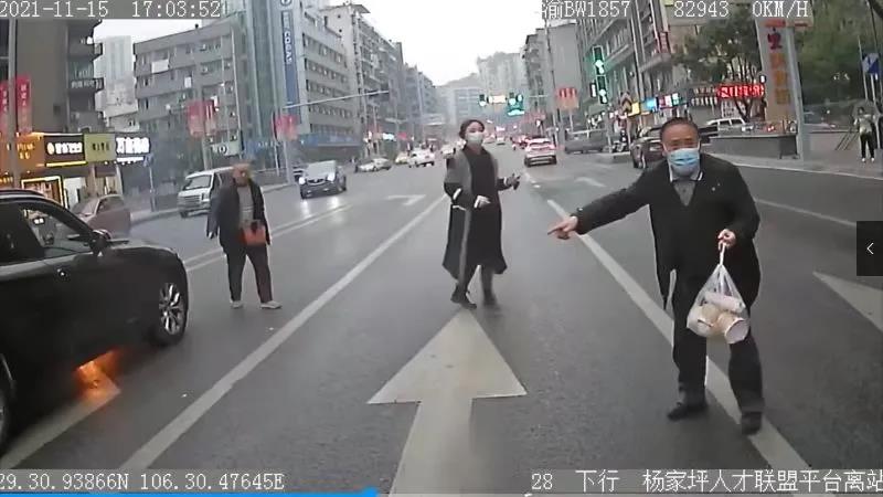 11月15日下午5点左右,正值下班高峰期,公交司机邓翔载着乘客行驶,在前方不远处,突然有两位老人冲到路中央,一边指着旁边一辆小车底部,一边大声呼救:“拿灭火器,快点快点”。邓翔这才发现,左侧车道一辆小车的底盘已经起火。