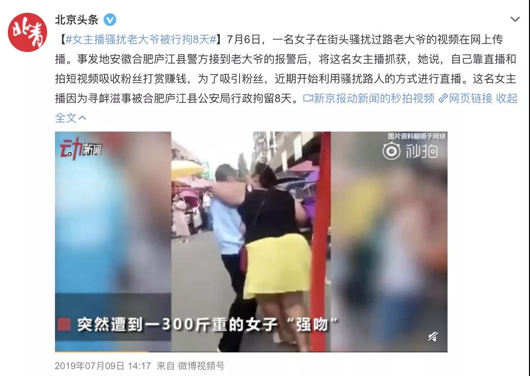 2019年7月,安徽合肥一名女主播为吸引粉丝,通过“骚扰”路人的方式直播。该女主播最终被公安机关以寻衅滋事行政拘留8天。