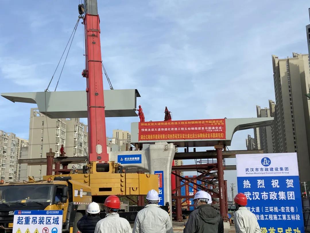 11月22日中午,在武汉市友谊大道(三环线—宏茂巷)快速化改造工程施工第五标段施工现场,工人们正在做首节钢箱梁吊装的最后准备,随着一声令下,一节横面长约3米、宽约13米的钢箱梁被缓缓起吊,数分钟后稳稳放在桥墩上。