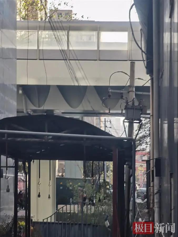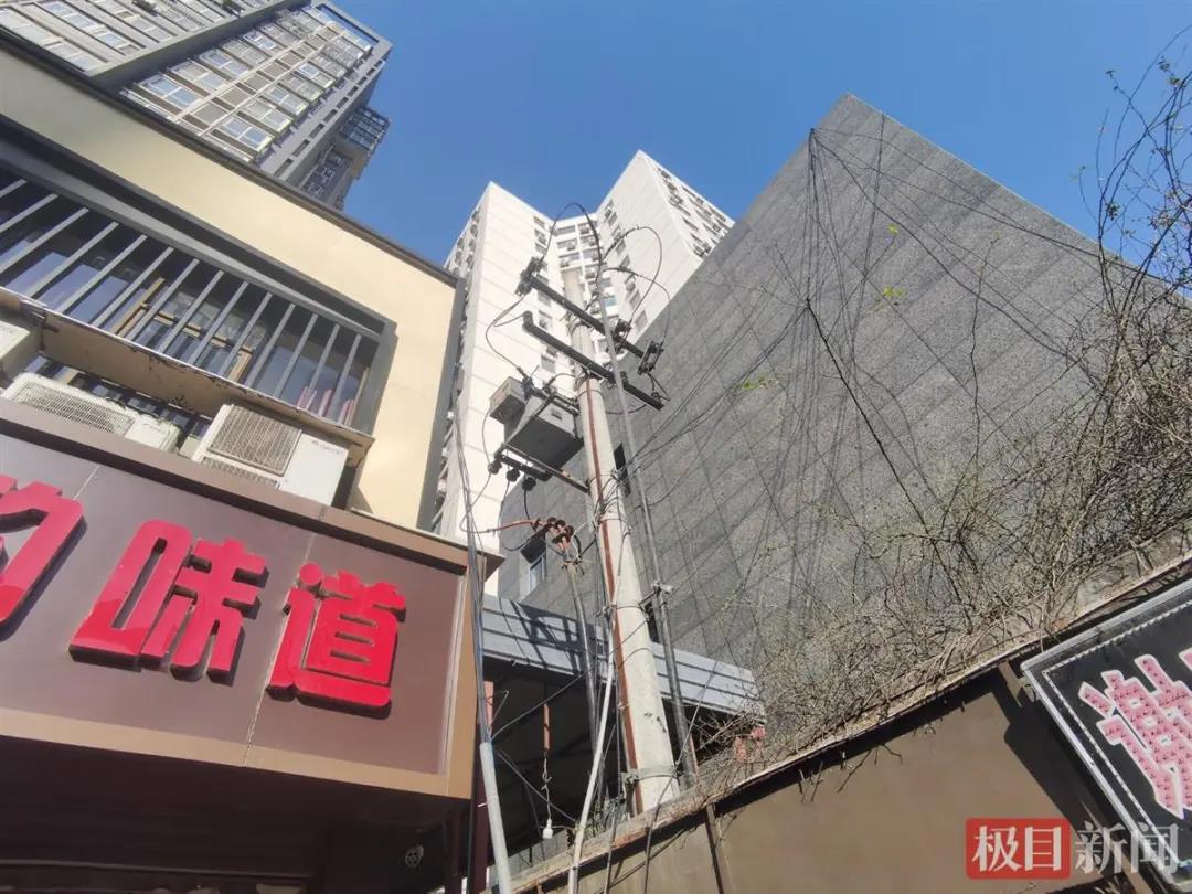 记者注意到,紧靠电线杆的楼栋只有两层,高度几乎与电线杆持平,而附近最近的楼栋位置距离电线杆也有数十米。