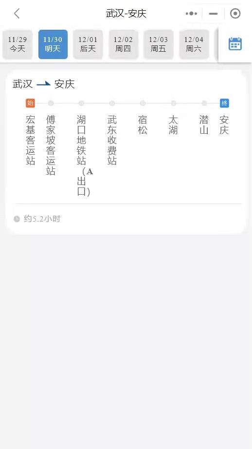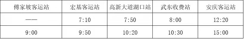 武汉→安庆:傅家坡客运站→宏基客运站→高新大道湖口站→武东收费站→安庆