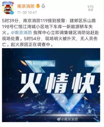 据@南京消防 消息,11月30日5时39分,南京消防119接到报警:建邺区乐山路198号仁恒江湾城小区地下车库一新能源轿车失火。@南京消防 指挥中心立即调集辖区消防站赶赴现场处置。5时54分,现场明火被扑灭,无人员伤亡。起火原因正在调查中。
