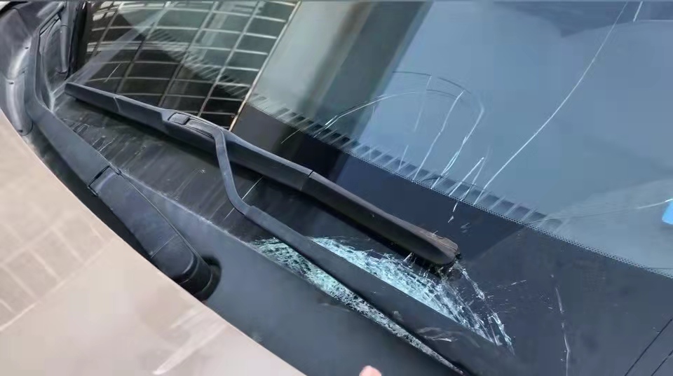 发生事故后驾驶员将车靠边停住,发现车辆的前挡风玻璃破了,于是就放弃追赶前车,现场报警后,将车开到了湖北高速交警云梦大队,民警现场勘查了车辆受损情况。