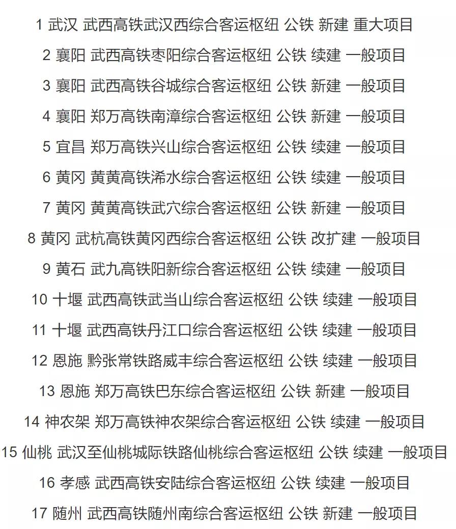 这17个项目均为铁路项目,大部分为高铁,包括武西、郑万、武杭、武九、黄黄高铁等,涉及武汉、襄阳、宜昌、十堰等11个地区,其中武西高铁武汉西综合客运枢纽是新建的重大项目。武汉至西安高铁分段实施,汉十高铁已通车,目前86.356公里的西十高铁湖北段全线开建,计划2026年6月30日竣工。目前从武汉去西安,高铁需经过郑州,呈直角绕行,最快需要4.5小时。武西高铁全线贯通后,武汉至西安全线均为时速350公里标准的高速铁路,时空距离将缩至2.5小时。