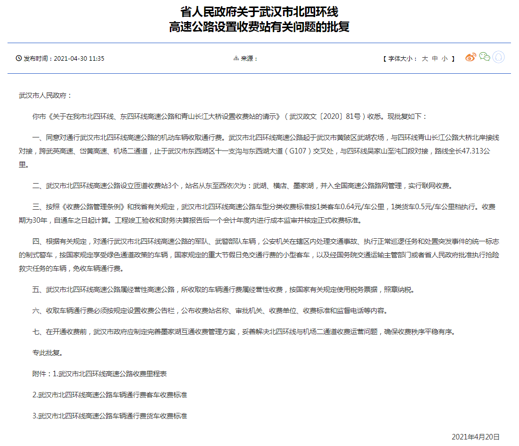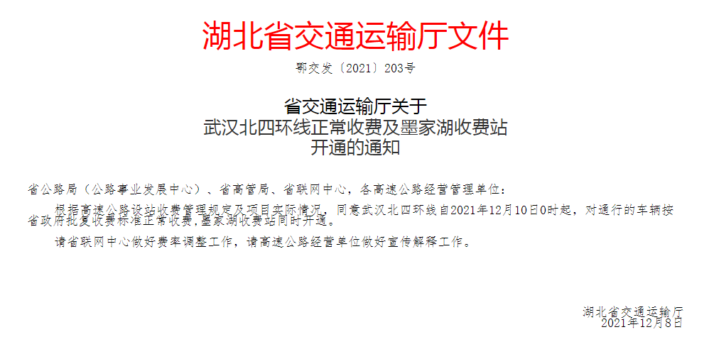 据湖北省人民政府、湖北省交通运输厅公开资料显示,武汉北四环线自2021年12月10日0时起,对通行的车辆按湖北省政府批复收费标准正常收费,墨家湖收费站同时开通。