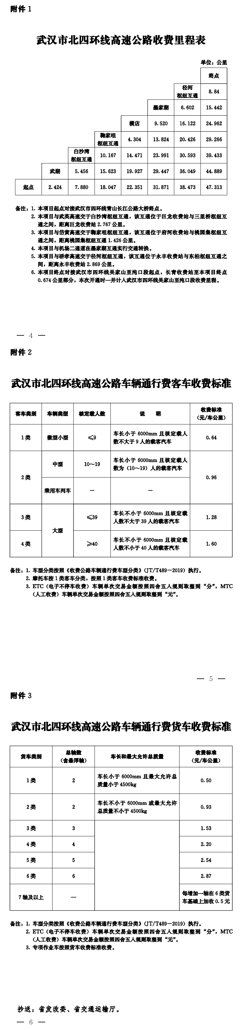 按照《收费公路管理条例》和我省有关规定,武汉市北四环线高速公路车型分类收费标准按1类客车0.64元/车公里,1类货车0.5元/车公里档执行。收费期为30年,自通车之日起计算。工程竣工验收和财务决算报告后一个会计年度内进行成本监审并核定正式收费标准。