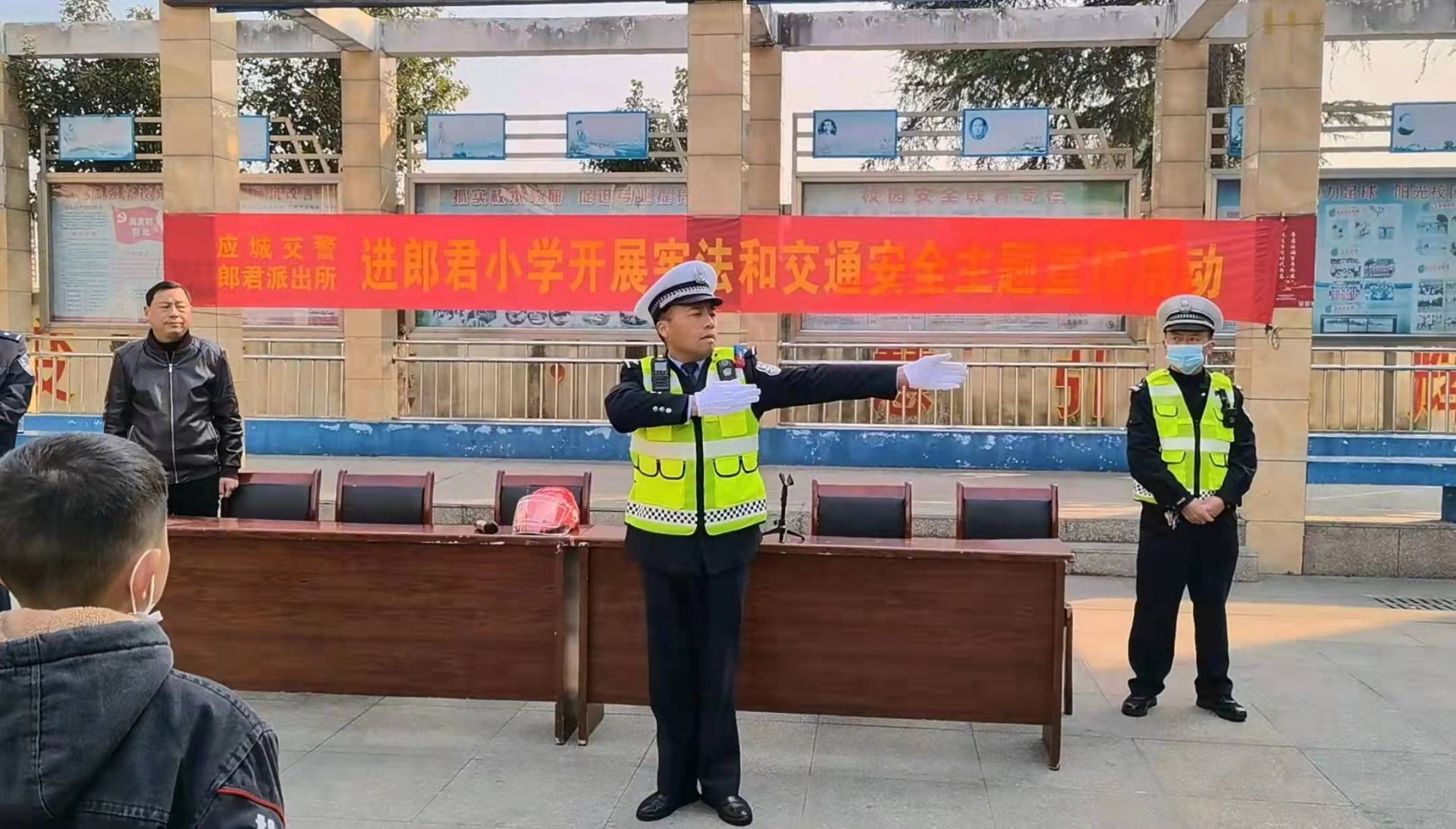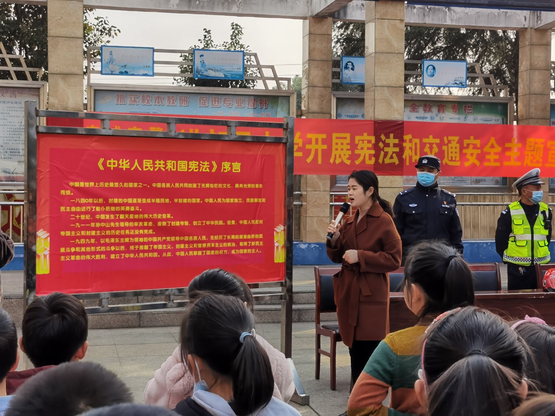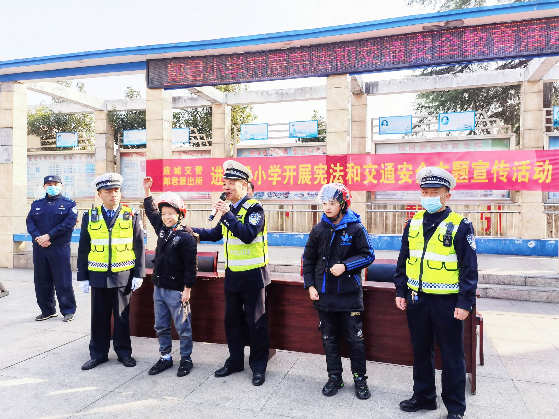 民警们结合小朋友的认知年龄,用孩子们喜欢的语言和方式开展互动教学,整个宣教活动分为两大环节。首先,民警组织全校学生认真集体朗读《宪法》序言和选学《宪法》有关条款,引导学生厚植爱国主义情怀,形成全校共同学习《宪法》、维护《宪法》权威的浓厚氛围。
