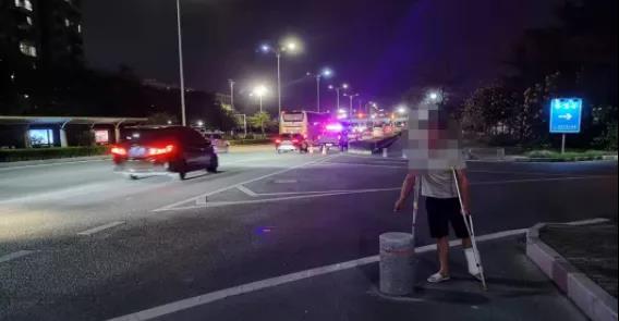 交警带着乘客到达事故现场进行指认勘查。乘客当时摔伤后,造成腿部骨折,打着石膏、杵着拐杖来到现场辨认。在现场,交警仔细勘查发现,事故现场已无明显痕迹,事故发生地有两个石墩。据乘客说,出事的地方就是这两个石墩处,而当时并没有其他车辆和行人经过。