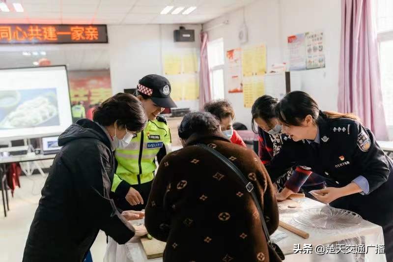 在美庐社区的活动室内,江岸区交通大队汉警快骑队员张慧、杜旖旎正在和社区居民一起其乐融融的包饺子。这是一场社区联欢活动,更是一次武汉交警的交通安全课堂授课现场。