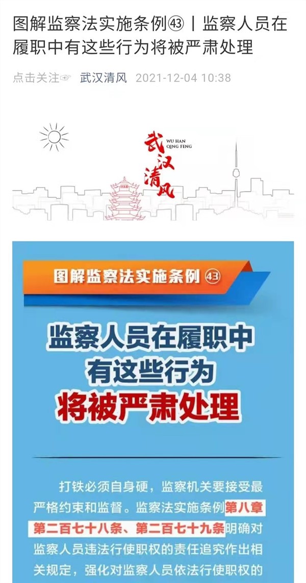 武汉市纪委监委利用官方微信公众号“武汉清风”常态化推送“图解监察法实施条例”系列稿件,为全市纪检监察干部学习交流提供线上平台。