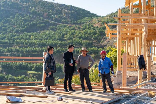 图为宣恩县李家河镇纪委紧盯白柚产业发展情况,在白柚基地内项目建设工地上走访了解有关情况