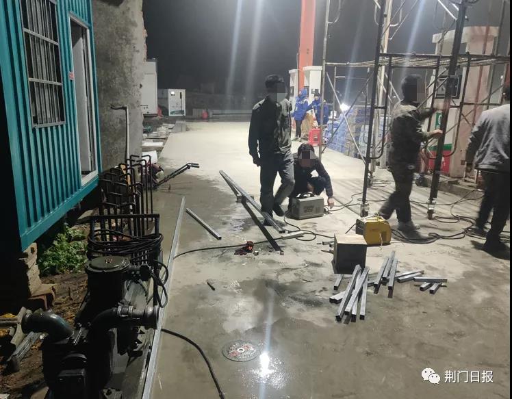 当晚7时许,荆门市应急管理局“百日双扫”(扫明风险点,扫除隐患点)执法检查组在京山宋河精细化工循环产业园结束检查后返程。路过宋河镇代坡加油站时,发现该站一台加油机上方有火花飞溅洒落在加油机周围。检查组迅速调转车头驶入该加油站突击检查,责令施工人员当即停止违法行为,并通过拍照、摄像等方式采集证据。