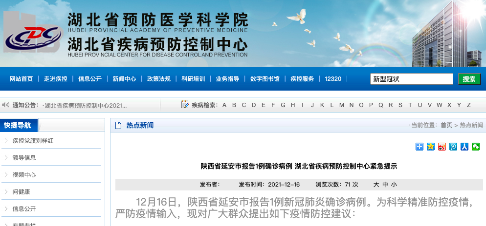 12月16日晚,湖北疾控发布紧急提示,要求12月13日(含)以来有陕西省延安市宝塔区旅居史的来鄂返鄂人员在做好个人防护的情况下,主动向当地社区进行健康申报,同时建议近期不要前往陕西省延安市宝塔区。