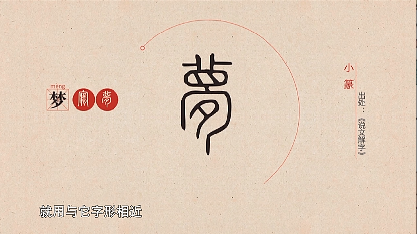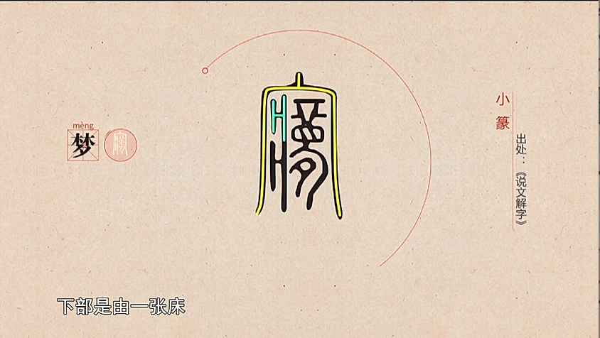 小篆的梦,上部是一个房子,下部是由一张床、一个突出眼睛的人和表示夜晚的夕组成的。表示人在晚上躺在房子里的床上做梦,后来由于字形过于繁琐,就用与它字形相近,原本表示黑暗模糊的梦取代了它。