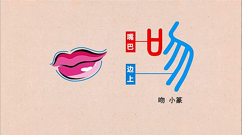 吻字的小篆字形,左边是口,表示嘴巴,右边是勿,表示边上。《说文解字》中有:吻,口边也。从口,勿声。意思是说吻字指的是嘴巴的周边,也就是嘴唇。