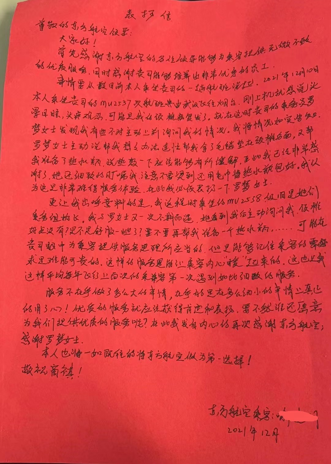 下机后,旅客将感谢信和锦旗寄到了东航总部,按照旅客提供的航班号和当班乘务员姓名,95530很快将感谢信和锦旗邮寄到了公司。