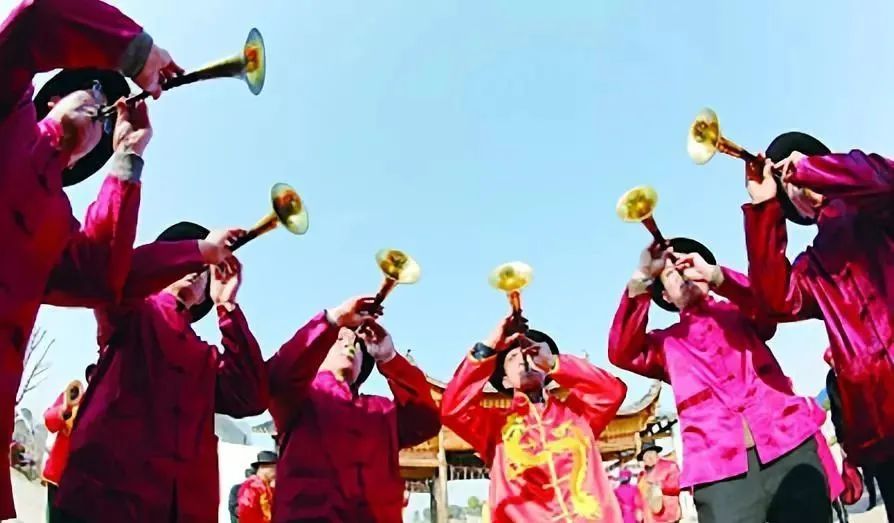 走进新洲农村,一阵阵欢快喜庆的锣鼓唢呐声吸引着游客们的注意。顺着声音到达村湾,只见十多个中年汉子身穿红色传统服装,你吹我打,好不热闹。这支乐队以大鼓为中心,以锣、钹、唢呐为圆弧形拱,高低错落地排列着,每个人都沉浸在锣鼓唢呐的旋律中,这便是新洲著名的“牌子锣鼓”。