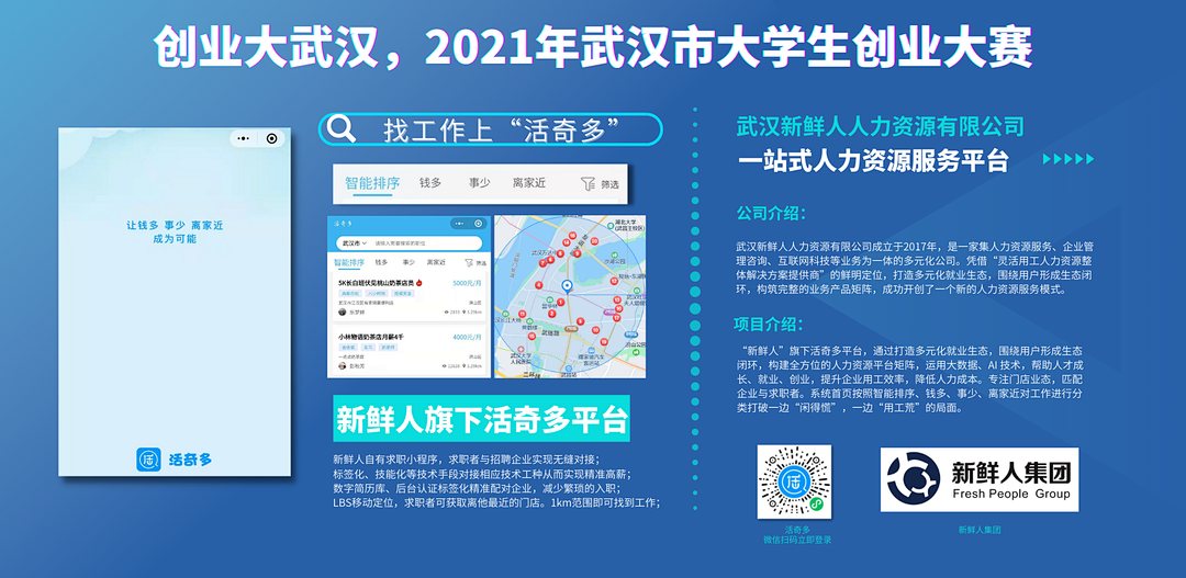 在刚刚落幕的武汉市人力资源服务业创新创业大赛中,新鲜人集团凭借自主可控共享用工项目荣获第四名的好成绩,单日2000人,三年10万人,年营收破亿元,在灵活就业的细分领域,2位90后创业者取得了骄人的成绩,也践行着当代大学生建功新时代的使命和担当。