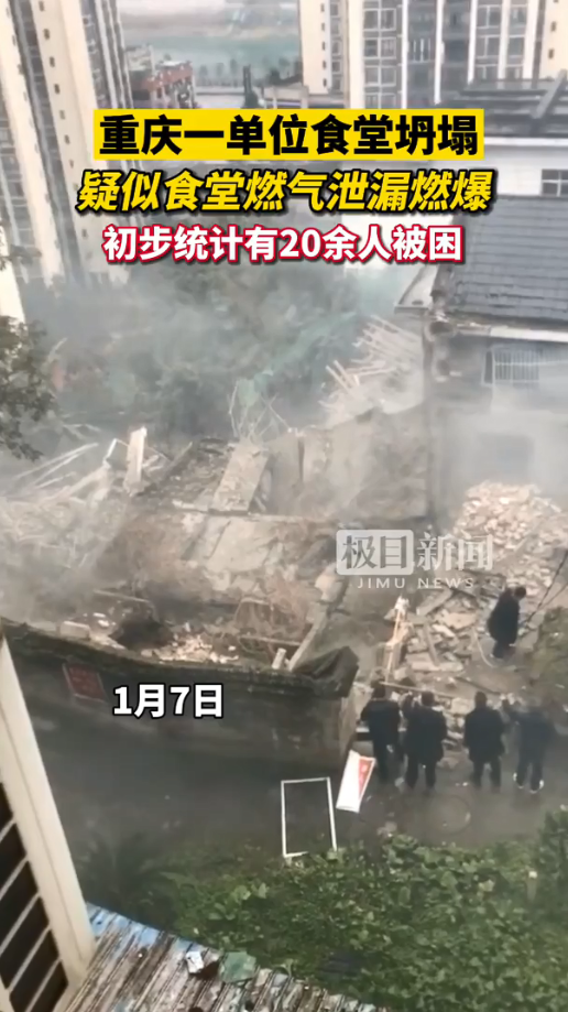 重庆市政府副秘书长、市政府新闻发言人杨琳介绍,1月7日12时10分左右,武隆区凤山街道办事处的机关食堂疑似燃气泄漏燃爆,导致房屋垮塌。