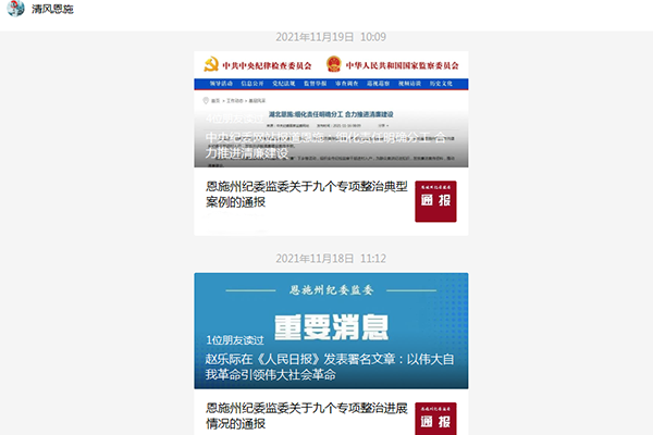 恩施州纪委监委不定期梳理九个专项整治进展情况和查处的典型案例,通过“清风恩施”微信公众号、州纪委门户网站等媒体平台,公开通报九个专项整治进展情况和查处的典型违纪违法案例,持续释放执纪必严、违纪必究的强烈信号,让人民群众在全面从严治党中不断增强获得感、幸福感、安全感。(恩施州纪委监委)