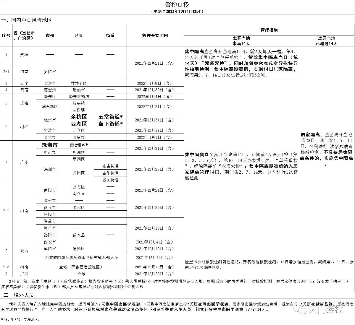 国内重点地区人员健康管理措施一览表2022年1月14日