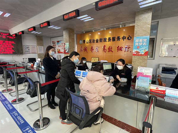 图为青山区冶金街纪工委工作人员到街道政务服务中心开展监督,推动窗口服务作风不断优化