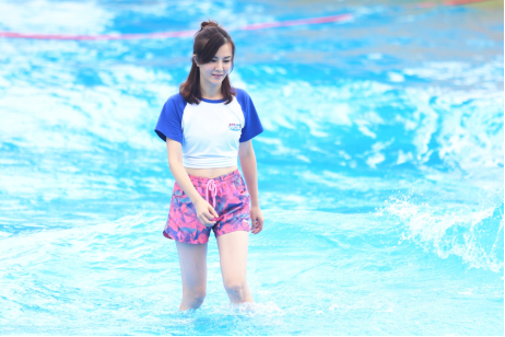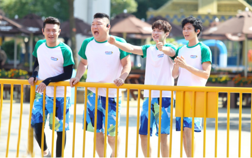 在荧幕中一直保持着清新靓丽、温柔持家的形象的演员刘孜,一出场就成为全场焦点。她扎着今年最时兴的“道士头”发型,将宽松的运动T恤在背后打了一个结,突显性感腰身。从武汉玛雅海滩水上公园的“大章鱼”项目中滑下来的一刻,刘孜仿佛出水芙蓉一般,Henry都忍不住凑到前面去,想看得更清楚。