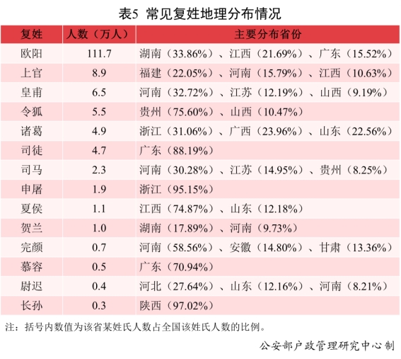 常见复姓“聚居”的特点非常突出,复姓人口在个别省份的分布较为集中。如,复姓“欧阳”33.86%的人口分布在湖南;复姓“上官”22.05%的人口分布在福建;复姓“皇甫”32.72%的人口分布在河南;复姓“令狐”75.60%的人口分布在贵州;复姓“诸葛”31.06%的人口分布在浙江;复姓“司徒”88.19%的人口分布在广东;复姓“司马”30.28%的人口分布在河南;复姓“申屠”95.15%的人口分布在浙江;复姓“夏侯”74.87%的人口分布在江西;复姓“贺兰”17.89%的人口分布在湖南;复姓“完颜”58.56%的人口分布在河南;复姓“慕容”70.94%的人口分布在广东;复姓“尉迟”27.64%的人口分布在河北;复姓“长孙”97.02%的人口分布在陕西。(详见表5)