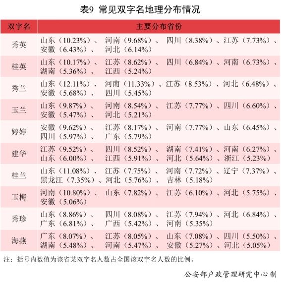 全国户籍人口中,使用频率最高的10个双字名依次为:秀英、桂英、秀兰、玉兰、婷婷、建华、桂兰、玉梅、秀珍、海燕。其中“秀英”名列榜首,使用人数为216.9万。男性使用较多的双字名仅有“建华”;其余常见双字名为女性使用较多,重名率明显高于男性。(详见表8)