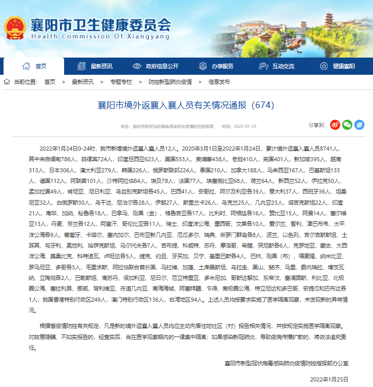 2022年1月24日0-24时,我市新增境外返襄入襄人员12人。2020年3月1日至2022年1月24日,累计境外返襄入襄人员8741人,其中来自缅甸786人,菲律宾724人,印度尼西亚623人,美国553人,柬埔寨438人,老挝410人,英国401人,新加坡395人,越南313人,日本306人,澳大利亚279人,韩国226人,俄罗斯联邦224人,泰国210人,加拿大188人,马来西亚167人,巴基斯坦133人,德国112人,阿联酋101人,沙特阿拉伯84人,埃及78人,法国77人,埃塞俄比亚68人,荷兰64人,新西兰52人,伊拉克50人,孟加拉国49人,肯尼亚、尼日利亚、乌兹别克斯坦各45人,巴西41人,安哥拉、阿尔及利亚各39人,意大利37人,西班牙36人,坦桑尼亚32人,白俄罗斯30人,乌干达、尼泊尔各28人,伊朗27人,斯里兰卡26人,乌克兰25人,几内亚23人,塔吉克斯坦22人,印度21人,南非、加纳、秘鲁各18人,巴拿马、刚果(金)、格鲁吉亚各17人,比利时、阿根廷各16人,赞比亚15人,阿曼14人,塞尔维亚13人,丹麦、芬兰各12人,阿富汗、哥伦比亚各11人,瑞士、印度洋公海、墨西哥、文莱各10人,爱尔兰、智利、津巴布韦、太平洋公海各9人,葡萄牙、卡塔尔、塞内加尔、巴布亚新几内亚、厄瓜多尔、瑞典、所罗门群岛各8人,波兰、以色列、吉尔吉斯斯坦、土耳其、匈牙利、奥地利、哈萨克斯坦、马尔代夫各7人,吉布提、科威特、苏丹、摩洛哥、希腊、突尼斯各6人,克罗地亚、蒙古、大西洋公海、莫桑比克、科特迪瓦、卢旺达各5人,捷克、约旦、牙买加、贝宁、基里巴斯各4人,巴林、刚果(布)、喀麦隆、纳米比亚、罗马尼亚、多哥各3人,毛里求斯、阿拉伯联合酋长国、马拉维、加蓬、土库曼斯坦、乌拉圭、黑山、斐济、马里、委内瑞拉、博茨瓦纳、立陶宛各2人,巴勒斯坦、南苏丹、保加利亚、尼日尔、厄立特里亚、多米尼加、哥斯达黎加、东帝汶、塞浦路斯、利比亚、北极圈公海、塞拉利昂、挪威、玻利维亚、赤道几内亚、南海海域、阿塞拜疆、乍得、南极圈公海、特立尼达和多巴哥、安提瓜和巴布达各1人;我国香港特别行政区249人,澳门特别行政区136人,台湾地区94人。上述人员均按要求实施了医学隔离观察,未发现新的异常情况。
