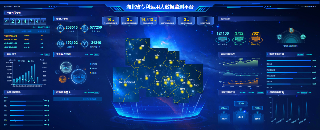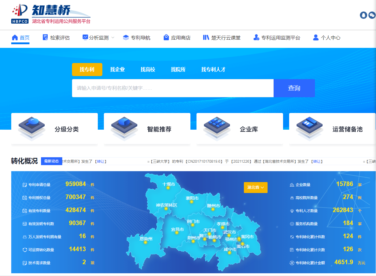 当前,“知慧桥”平台已建成包括“专利库、技术需求库、企业库、专利人才库、高校院所库、服务机构库”在内的六大基础数据库。平台汇集全球104个国家和地区的1.3亿条专利信息,从全国近4000万条专利信息中清洗、收录全省95.9万条专利信息,建立湖北专利信息全库;在全省165.6万户企业库中,标引19.6万家有科技创新活动的中小企业,1.4万家高新技术企业,建立湖北专利转化企业库;利用专利库,初步建成包含26.28万人的专利技术人才库;当前平台已收录湖北境内140所高校、134家科研院所和184家知识产权服务机构的基本信息和专利信息,支持多维度检索查询。
