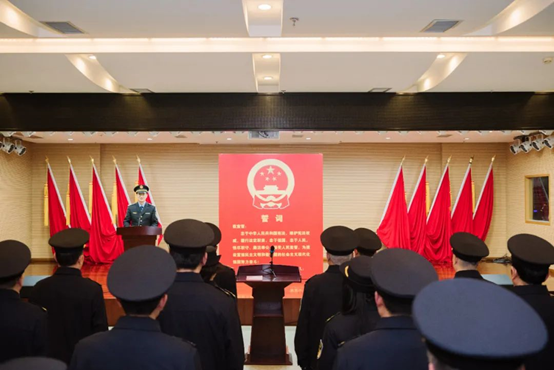 仪式上,广大党员干部身着新式执法制服,整齐列队,高举右手,在领誓人周德文的带领下集体向宪法庄严宣誓。
