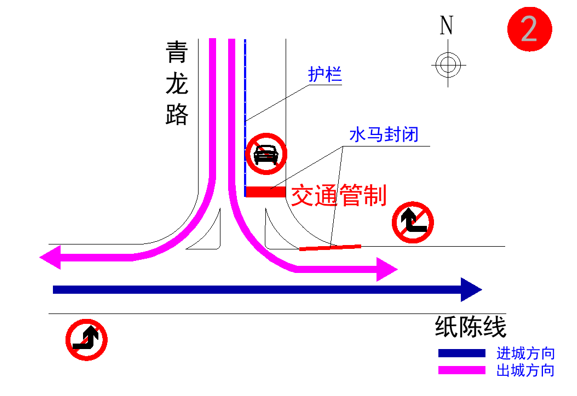 2、纸贺线与青龙南路:纸贺线由南往北进城车辆禁止直行,一律在该路口右转,从纸陈线、天子山大道绕行进城;纸贺线由北往南车辆禁止左转,一律直行(公交车及公勤救援车辆除外)。