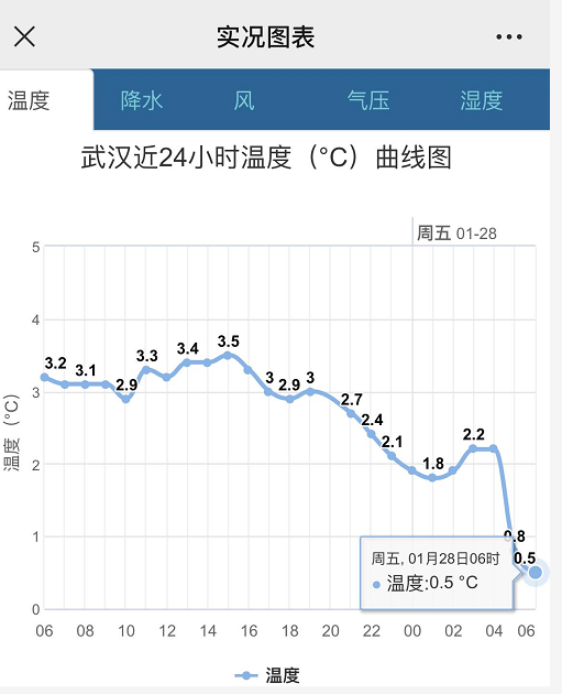 早间7时,武汉气象部门发布过去24小时天气实况:昨天白天到前半夜武汉小雨,今天凌晨4时以后大部地区转为雨夹雪或中到大雪,累计雨雪量大部在4-8毫米,其中蔡甸出现积雪,积雪深度达1cm,最高气温3℃-5℃,最低气温0-2℃,偏北风3-4级,阵风5级。