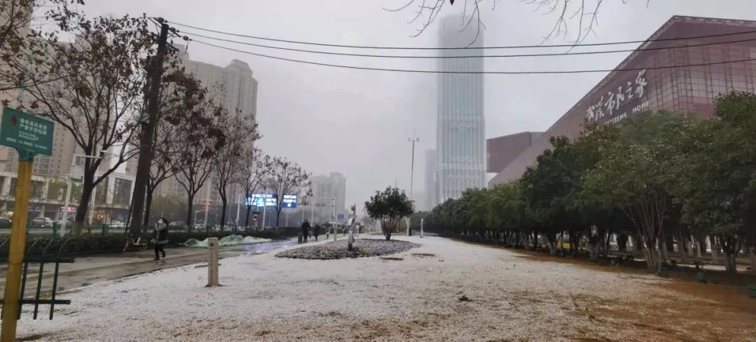武汉市民之家附近,薄薄的积雪 记者梁延供图