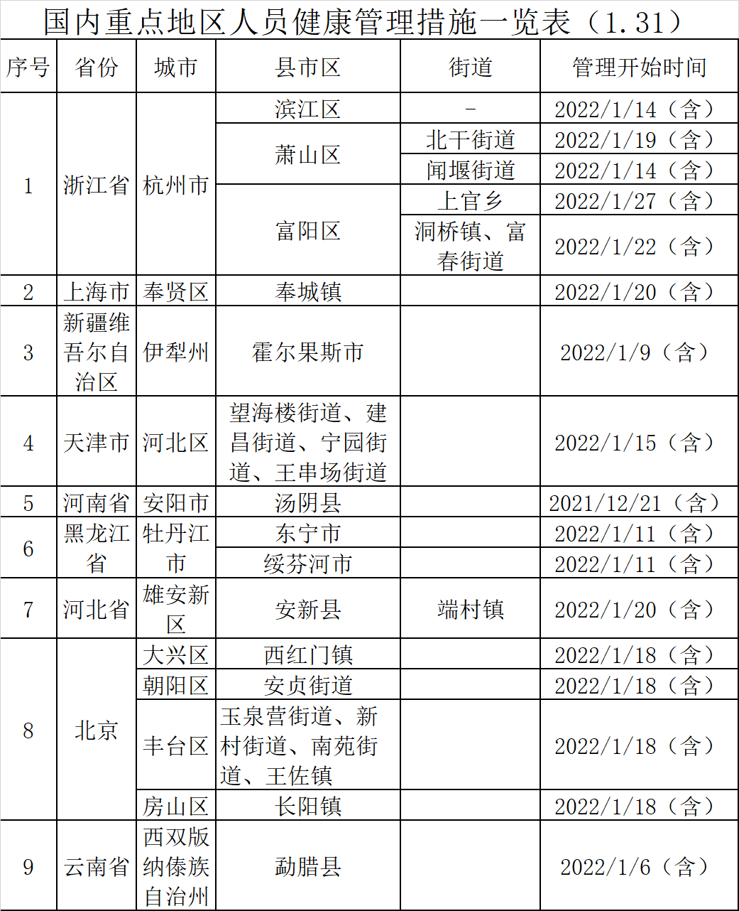 1月31日,天津市河北区部分区域升级为中风险地区,根据湖北省防指调整重点地区管控措施,为严防疫情输入,科学精准防控疫情,有效控制和降低疫情传播风险,对2022年1月15日(含)以来有天津市河北区建昌街道、宁园街道、王串场街道旅居史的来鄂返鄂人员实施健康管理措施,调整部分地区来鄂返鄂人员健康管理措施。现对广大群众提出如下疫情防控提醒: