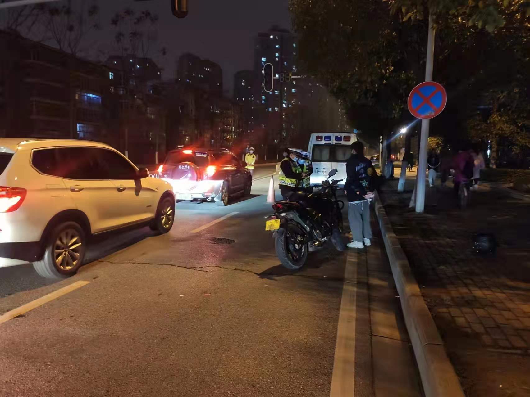 1月31日(除夕)晚,洪山区交通大队组织警力在辖区各重点路段开展夜间整治行动,持续加强路面巡查治理。晚8时许,一中队副中队长牟樑带队在欢乐大道设点开展盘查时,发现两辆炸街摩托车伴随着轰鸣声由北向南行驶而来,于是迅速将车辆拦下进行检查。