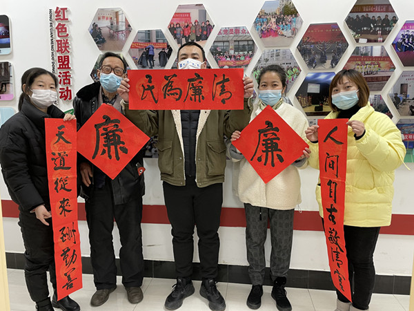 春节前夕,汉阳区江堤街江腾社区组织党员干部开展“年俗幽幽话春廉 清风丝丝入家庭”活动,翰墨清风,书法传廉,弘扬优良家风。