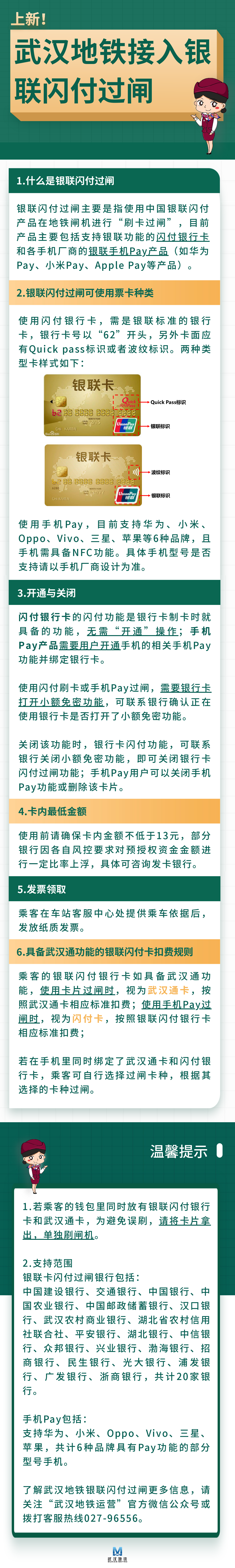 2月8日起,武汉地铁正式接入银联闪付过闸业务。市民乘客可使用绑定了银联卡的手机、手表、手环,或任一银行发行的带有“闪付”标识的银联IC卡(包括借记卡、信用卡),靠近闸机感应区,即可“一挥即付”进出站,乘车费用直接从相应的银联卡账户中扣除。